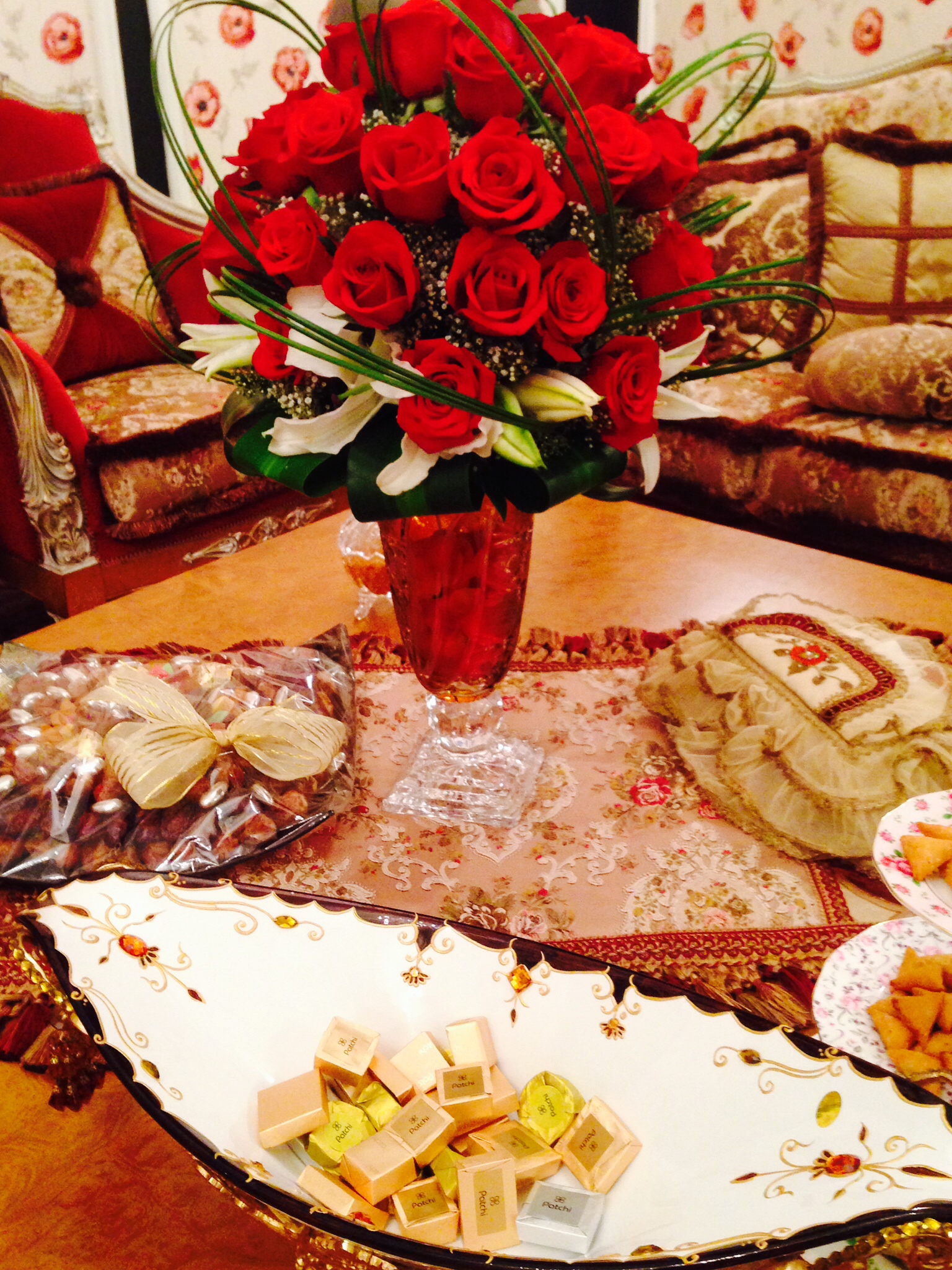 We sat in the ladies majlis, a formal entertaining room off of the center entrance hall, which was decorated in a bold rose decor and offered a variety of seating options for more than 30+ ladies. I could tell this wasn’t the type of event that only occurs when someone gets married or has a baby, or some other typical life milestone; but instead, this rooms gets a lot of use — these ladies gather frequently and this room offers all the accoutrements necessary for a super swanky tea party. Hired Filipina ladies served up Arabic coffee, tea, and dates in exquisite dishes as I relied upon Brenda to fill me in. What is this? What will it do to me? And should I partake? Which basically means, will this have me glued to the powder room while I am here at this super swanky event?